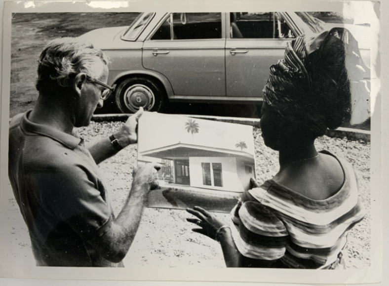 A British salesman for the United Africa Timber Company in Nigeria is pitching a prefab house made from Nigerian-sourced and produced plywood to a local woman.